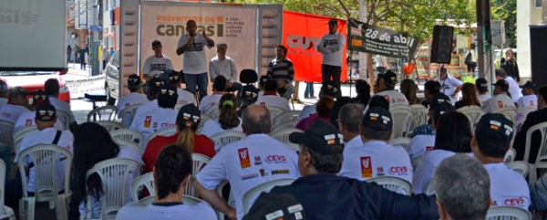 Cerca de 300 pessoas, entre dirigentes sindicais, profissionais da saúde, segurados e população em geral participaram do ato realizado numa tenda instalada na quadra da Rua XV de Janeiro, em frente à prefeitura e agência central dos Correios de um lado e, de outro, a Praça da Emancipação.