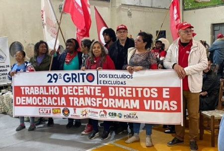 “Aqui em meio a um período de tragédia no Rio Grande do Sul – lamentamos as mortes e as perdas de infraestrutura das cidades, dos patrimônios, enfim dos espaços de trabalho das pessoas -, estamos fazendo o Grito dos Excluídos e Excluídas, afirmando o compromisso de continuar lutando por direitos, saúde, educação, trabalho decente, inclusão da juventude, respeito às mulheres, aos negros, aos povos originários”, disse o presidente da CUT-RS, Amarildo Cenci.