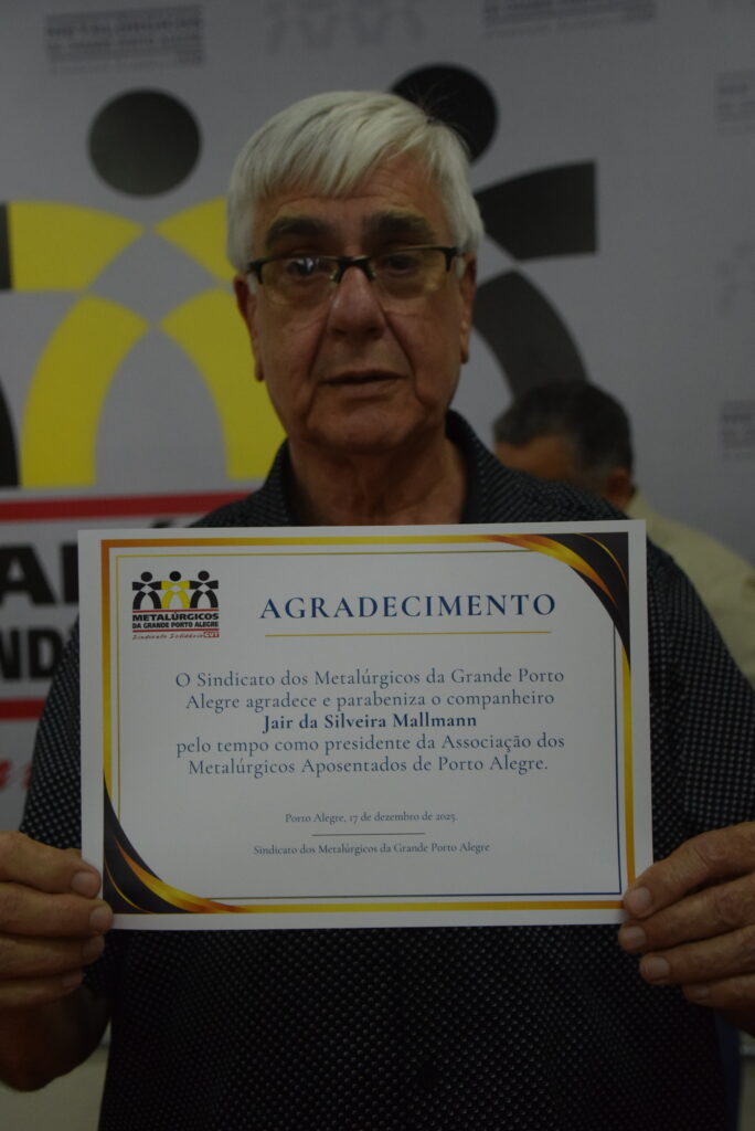 O ato reuniu diretores, representantes sindicais e autoridades, marcando um momento de renovação e também de emoção para a entidade. Durante a cerimônia, foi realizada uma homenagem a Jair Mallmann, que encerra seu ciclo à frente da direção da AMAPOA. Em sua fala, Jair lembrou o falecimento do companheiro João Batista do Amaral, associado da entidade que veio a falecer no próprio dia da posse. Visivelmente emocionado, prestou sua homenagem com lágrimas nos olhos, ressaltando a trajetória de luta e compromisso do metalúrgico.