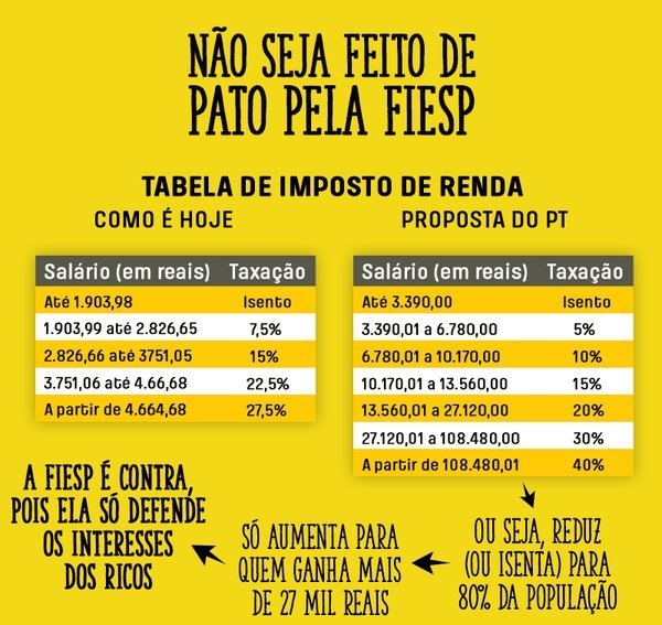 O trabalhador não pode pagar a conta dos que ganham muito mais que ele. Queremos uma tabela mais justa, como a que foi apresentada pelos deputados do PT e que prevê as seguintes faixas: