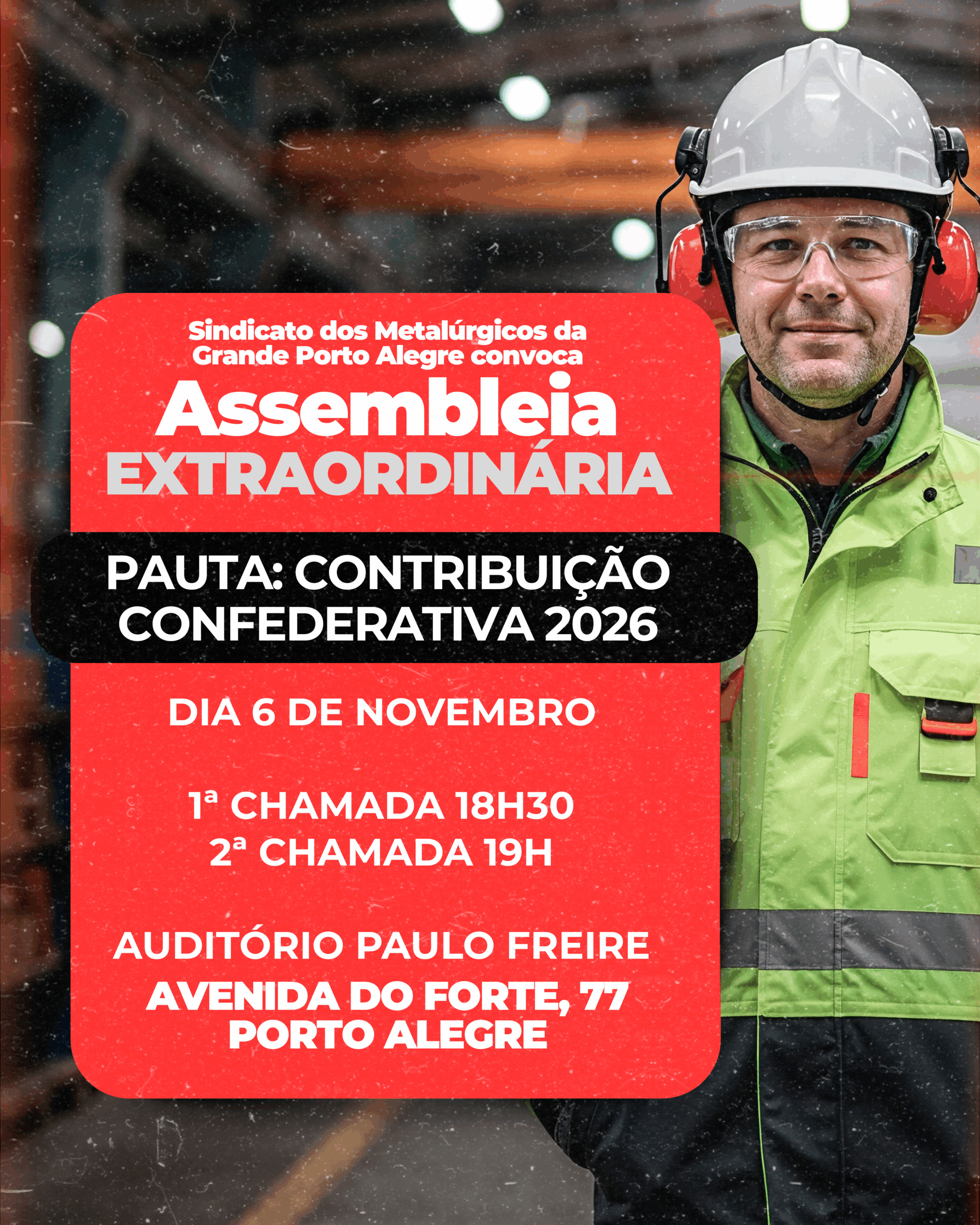 O Sindicato dos Metalúrgicos da Grande Porto Alegre convoca todos os trabalhadores e trabalhadoras da categoria para uma Assembleia Extraordinária, que será realizada no dia 6 de novembro, no Auditório Paulo Freire (Avenida do Forte, 77 – Porto Alegre).